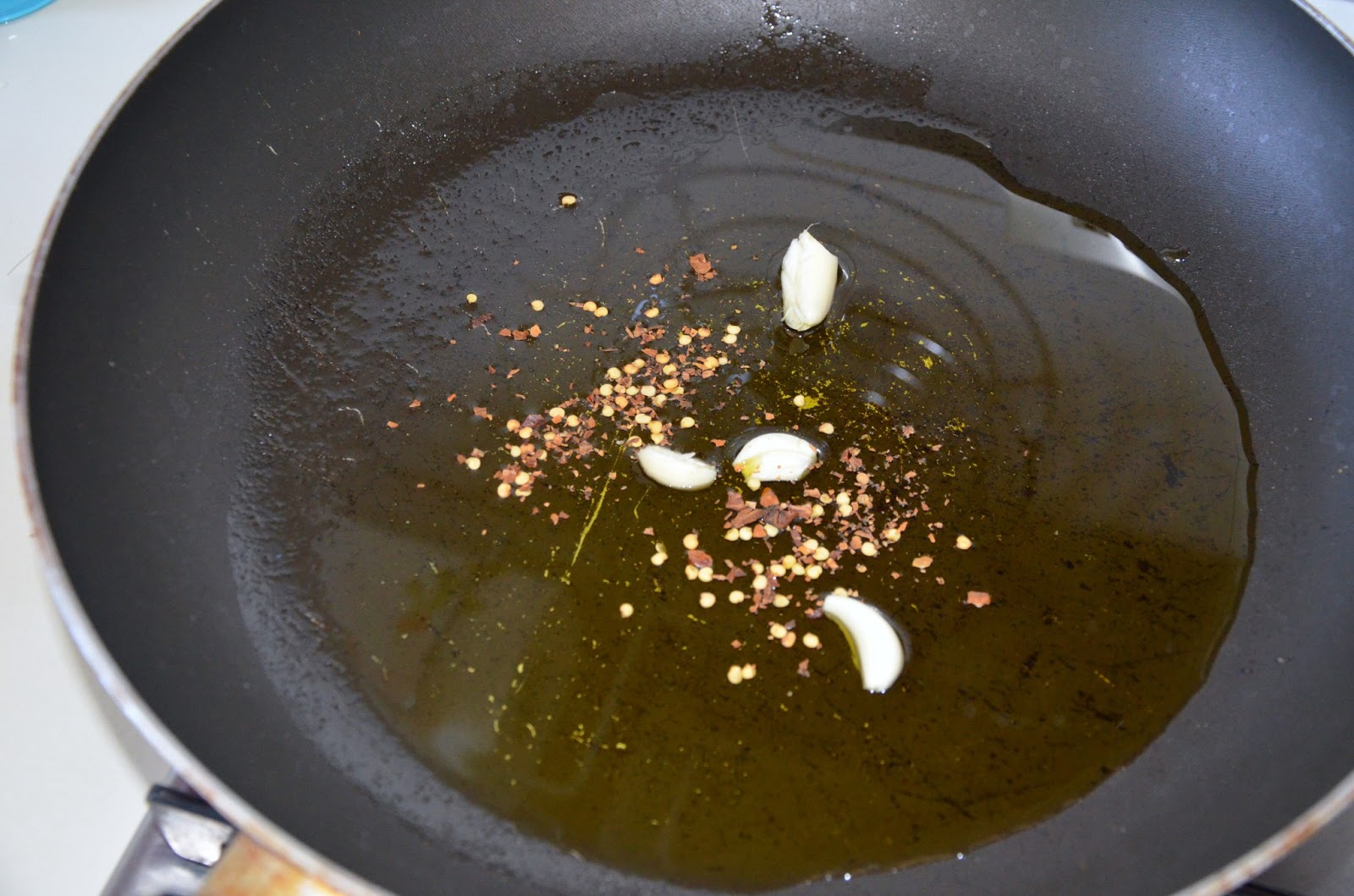 | In una padella mettere dell'olio, dell'aglio e del peperoncino e far andare per un pochino evitando di far bruciare l'aglio |