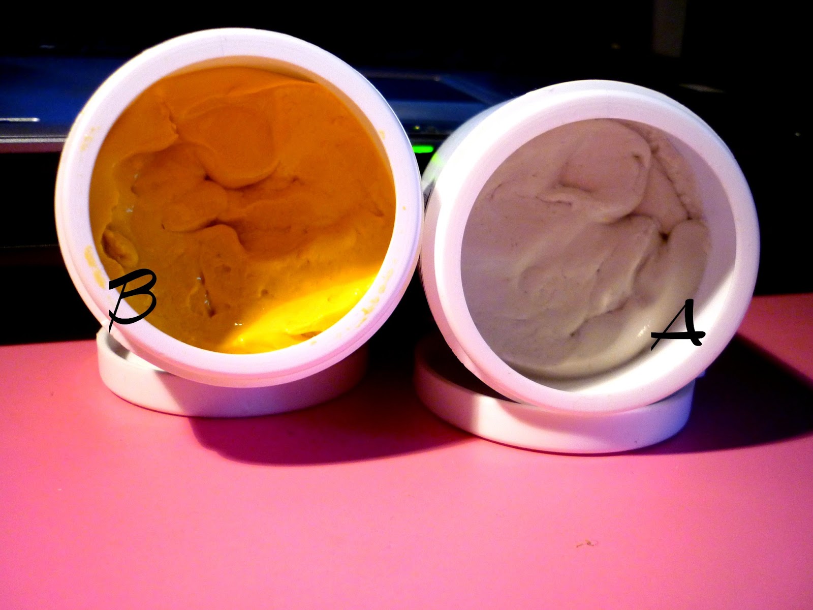 Questa pasta si presenta in due barattolini da 80ml l'uno: contenitore A (composto grigio) e contenitore B (materiale giallo).