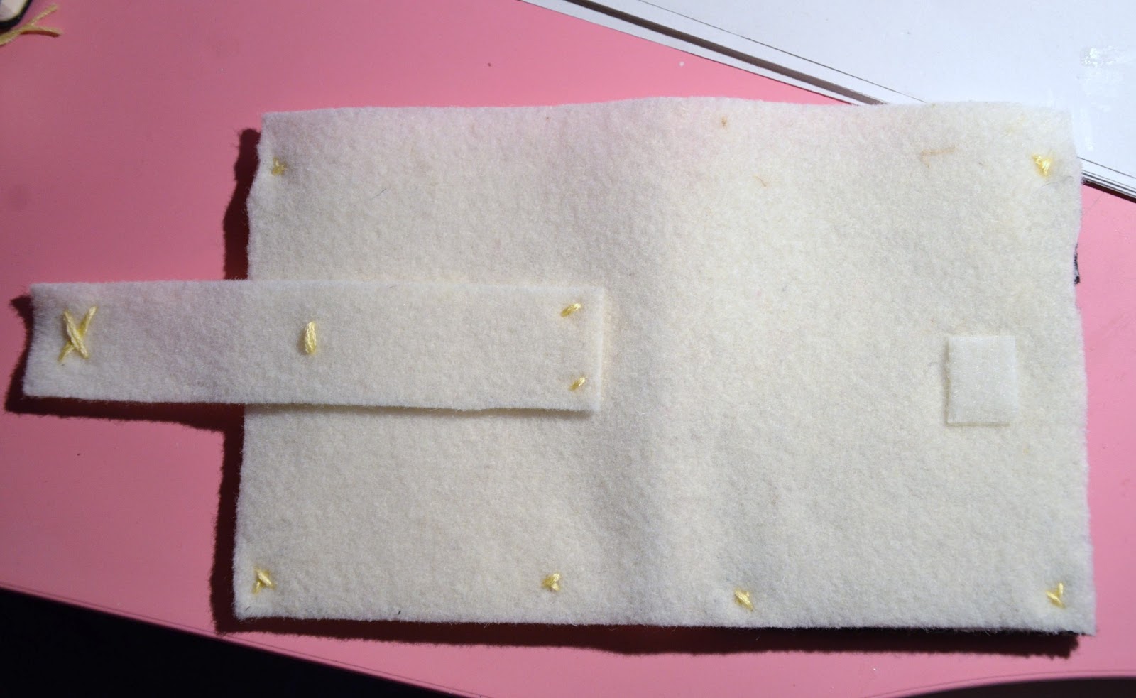 | Sul retro del portafoglio metto una striscia di pannolenci che mi servirà per chiudere il borsellino; fisso anche questo con ago e filo e all'estremità interna del laccio metto un triangolino di velcro che utilizzerò anche dalla parte esterna opposta come potete notare dalla foto |